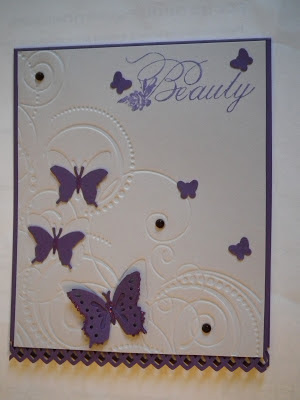 I've got another older card to show you today. I embossed the background and punched the bottom edge and all the butterflies. Beauty was stamped in purple in in one corner and some jewels were added at the centers of the curls. I'm hoping to have some new cards for you later this week.